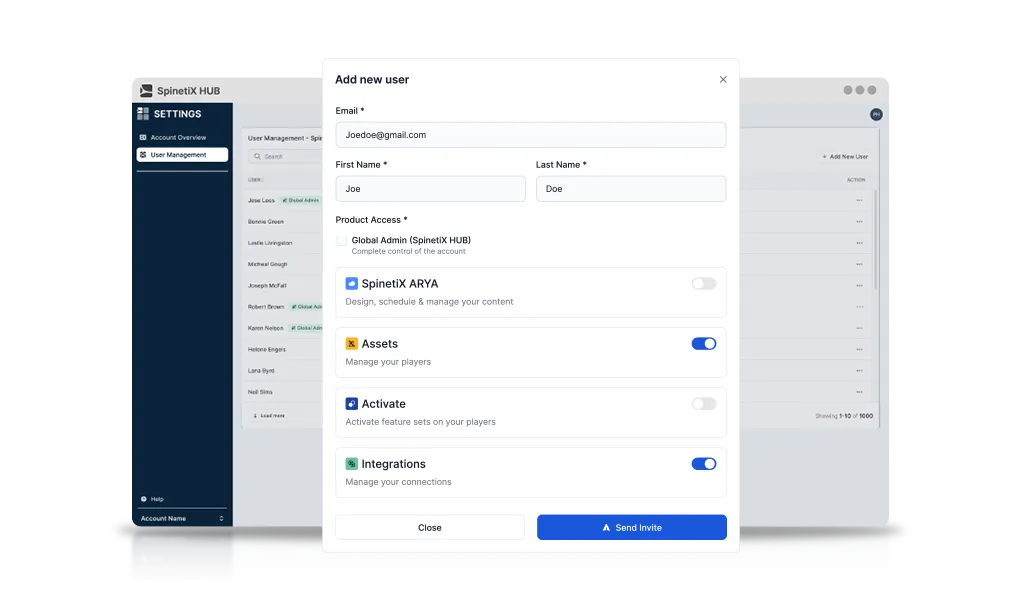 More than just a cloud platform, HUB serves as your central command center, built on our DSaaS (Digital Signage as a Service) model. Invite users, assign access to third-party data, and control account permissions with ease. HUB makes onboarding fast, simplifies management, and scales with your needs.